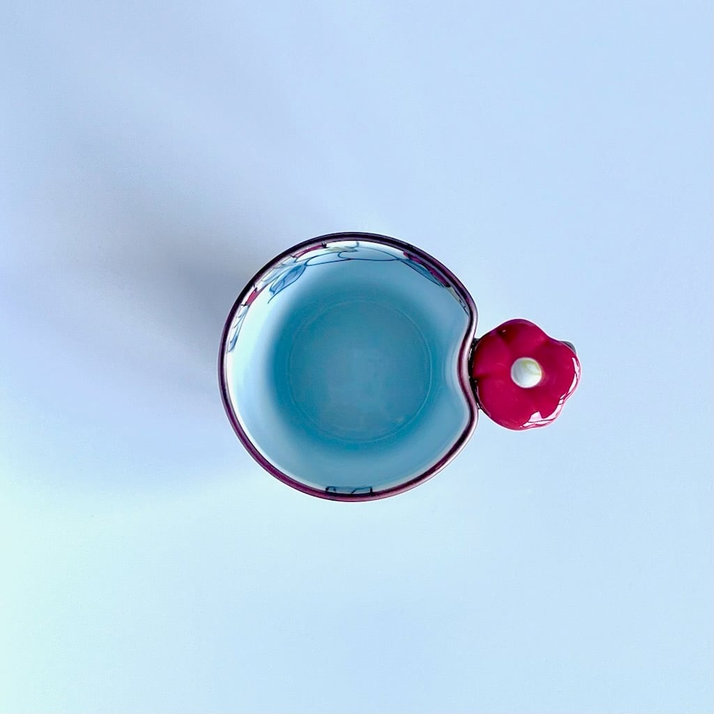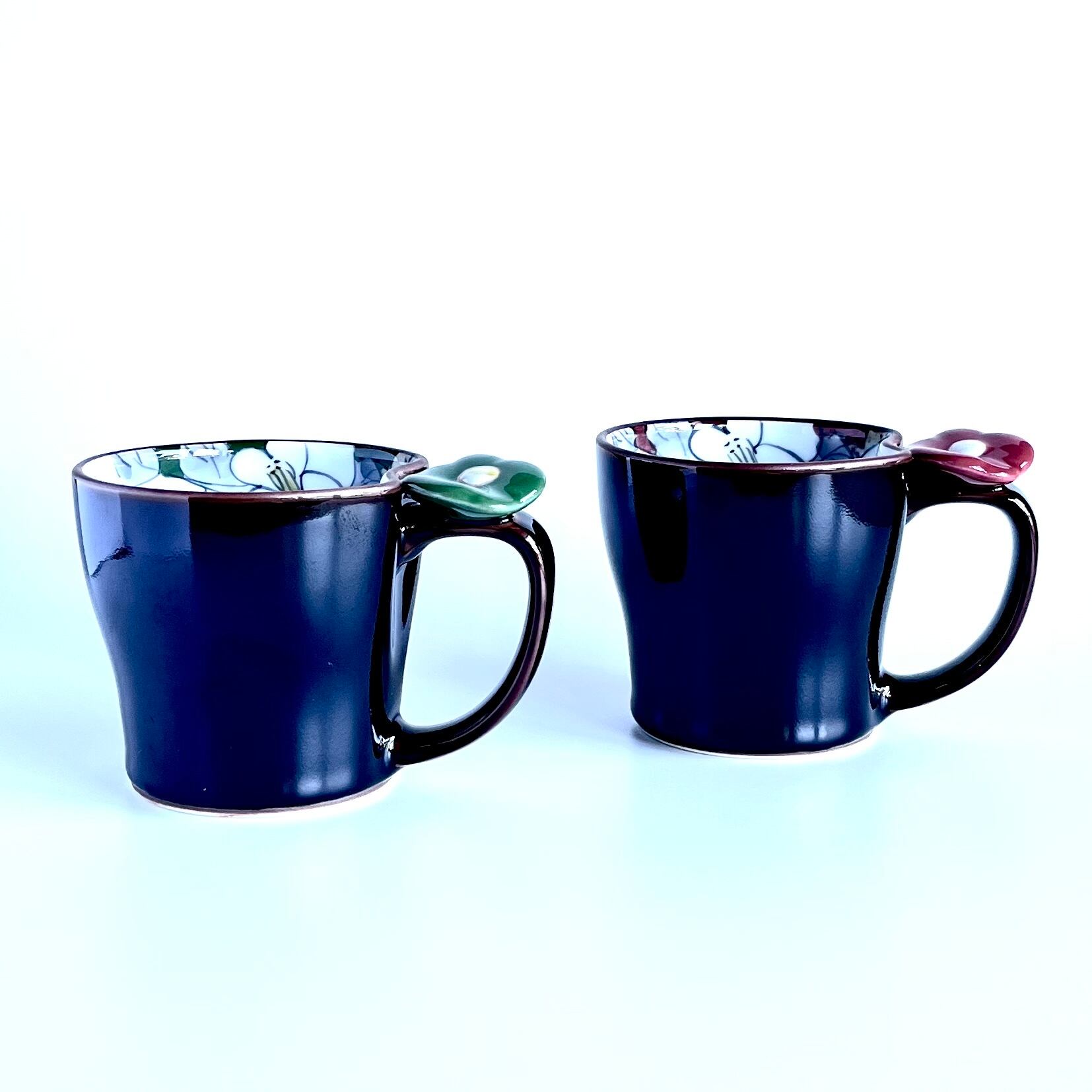 カップの内側には椿が描かれています。マグの取っ手には花のモチーフが
